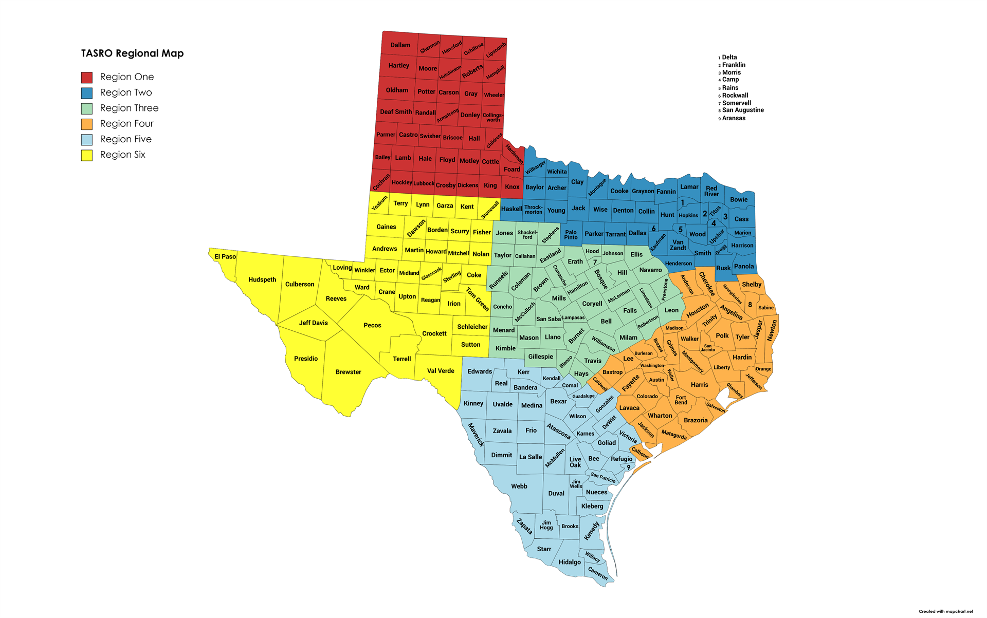 If you are interested in filling a vacant regional director position in your region please complete an application. Some of the regional director responsibilities include, conducting regional meetings, organize regional training opportunities, being the spokesperson to the board for your region, recruiting in your region, and serving on committees. For additional requirements to serve as regional director please review the TASRO By-laws.